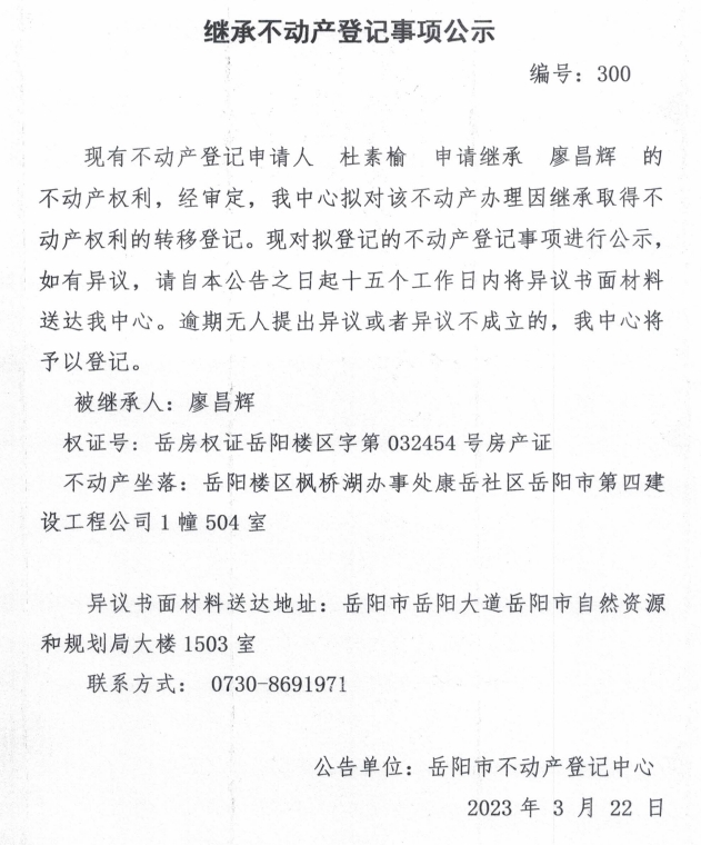 继承不动产登记公示 编号:杜素榆(300)