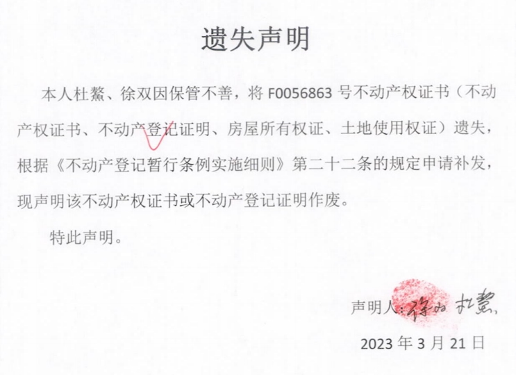 遗失声明(杜鰲、徐双)