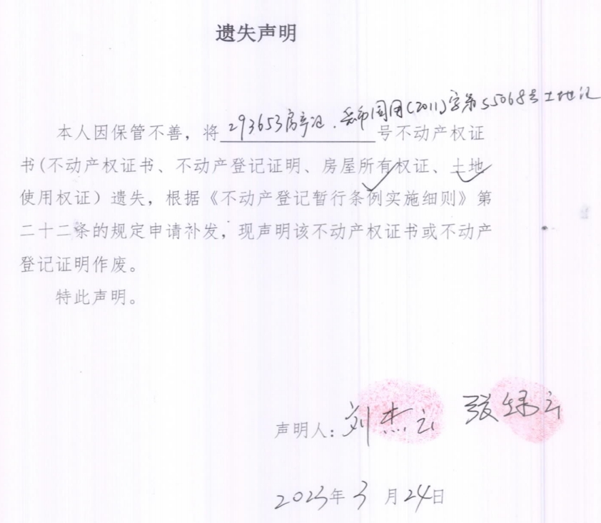 遗失声明(刘杰云、张绿云)