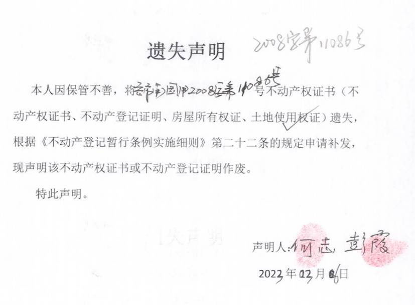 遗失声明(何志、彭霞)