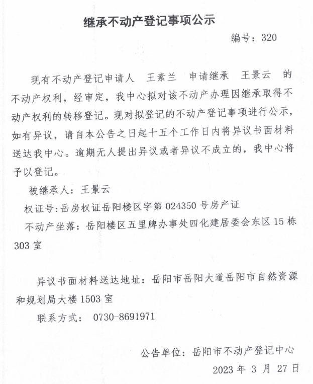 继承不动产登记公示 编号:王素兰(320)