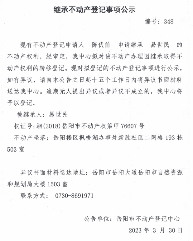 继承不动产登记公示 编号:陈伏前(348)