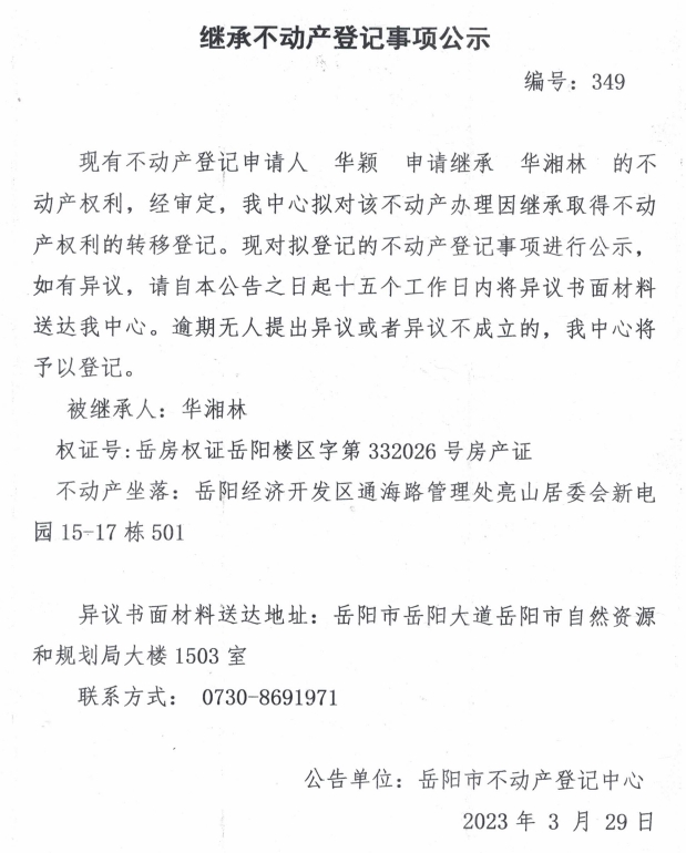 继承不动产登记公示 编号:华颖(349)