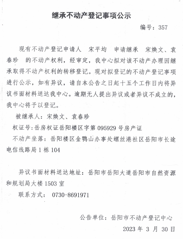 继承不动产登记公示 编号:宋平均(357)