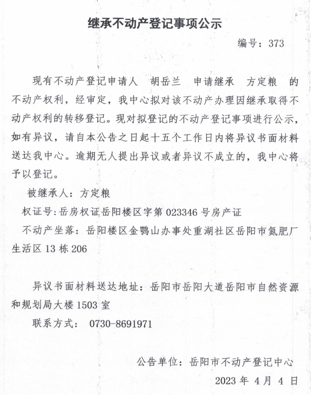 继承不动产登记公示 编号:胡岳兰(373)