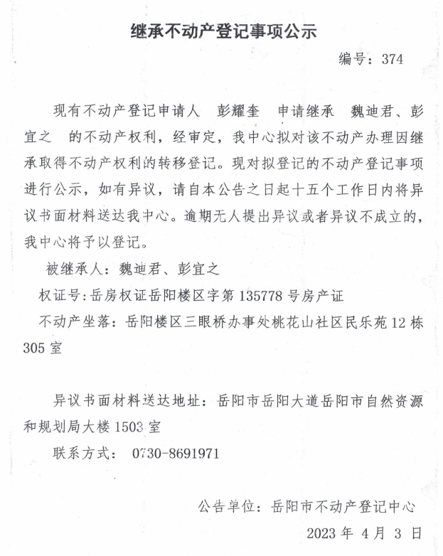 继承不动产登记公示 编号:彭耀奎(374)