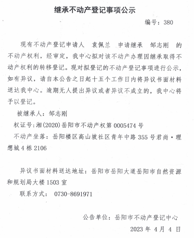 继承不动产登记公示 编号:袁佩兰(380)