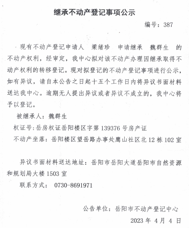 继承不动产登记公示 编号:梁绪珍(387)