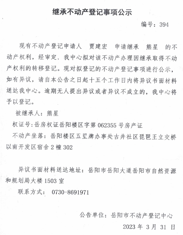 继承不动产登记公示 编号:贾建宏(394)