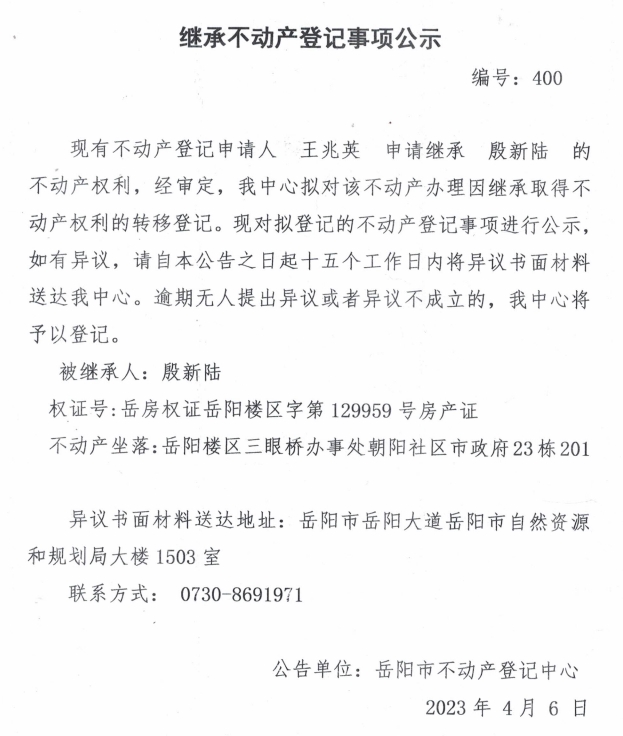 继承不动产登记公示 编号:王兆英(400)