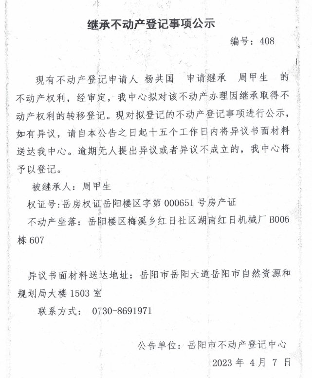 继承不动产登记公示 编号:杨共国(408)