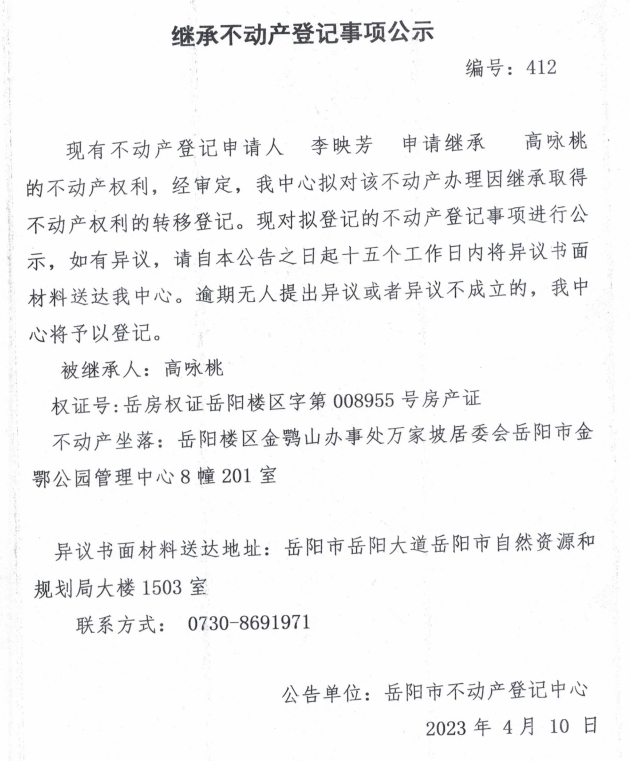 继承不动产登记公示 编号:李映芳(412)