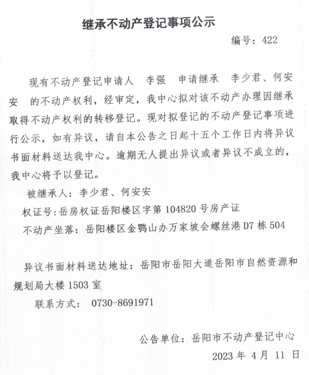 继承不动产登记公示 编号:李强(422)
