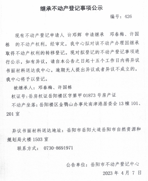 继承不动产登记公示 编号:许邓辉(426)