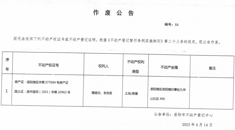 作废公告 编号:53(蒋建洪、李含英)