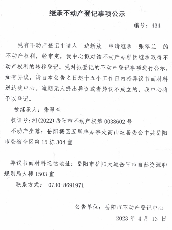 继承不动产登记公示 编号:边新放(434)