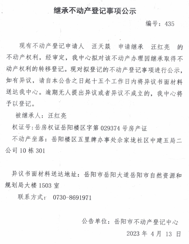 继承不动产登记公示 编号:汪天燚(435)