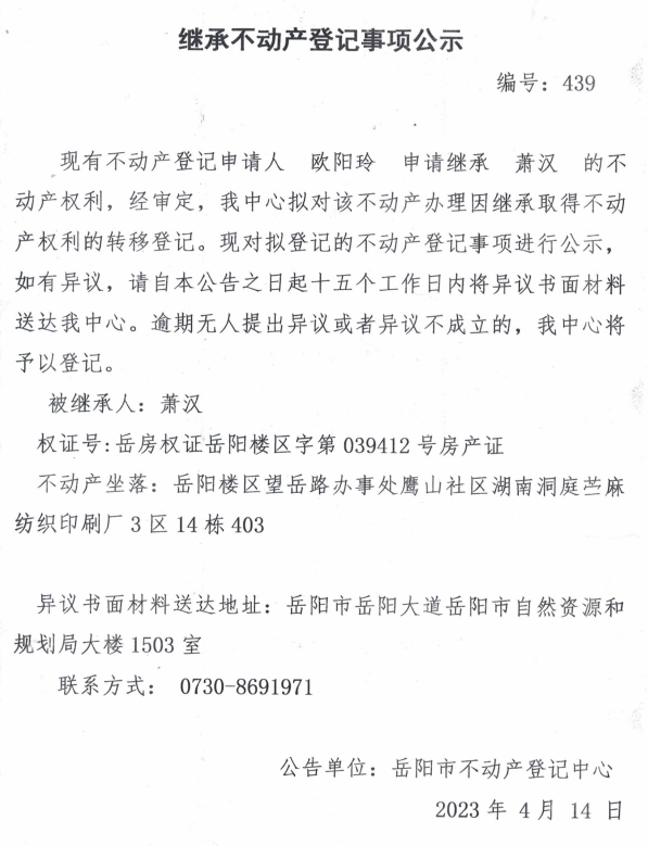 继承不动产登记公示 编号:欧阳玲(439)
