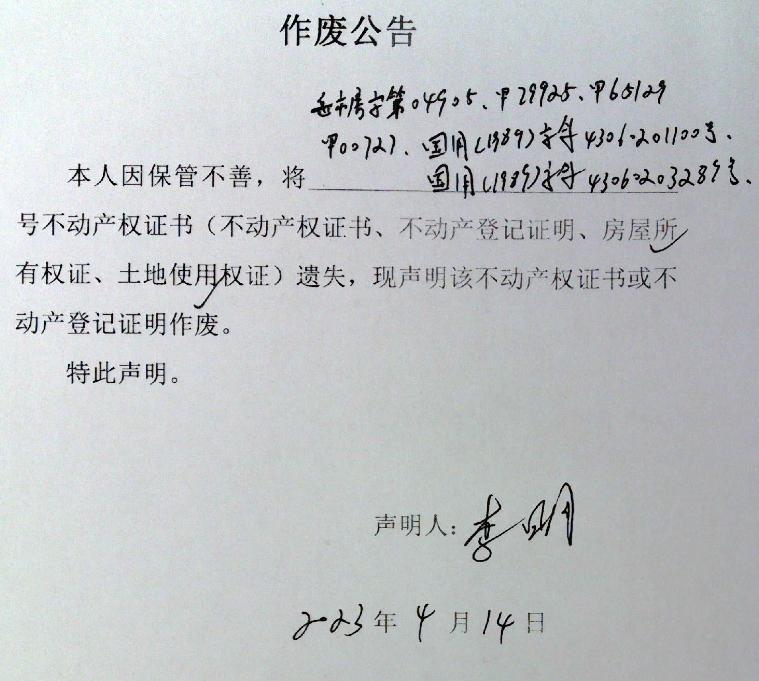 作废公告(岳阳楼区吕仙亭片区老旧小区改造项目部,李明代)