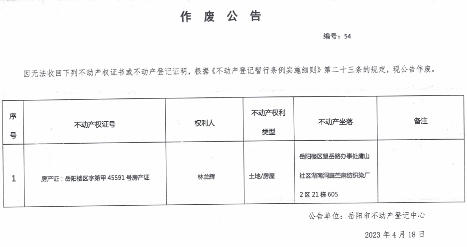作废公告 编号:54(林兰辉)