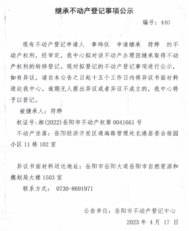 继承不动产登记公示 编号:章玮仪(440)