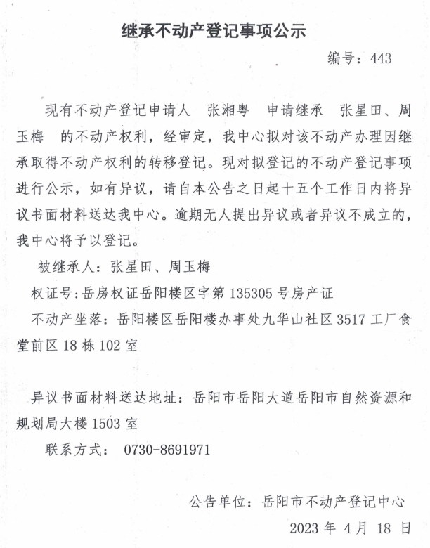继承不动产登记公示 编号:张湘粤(443)