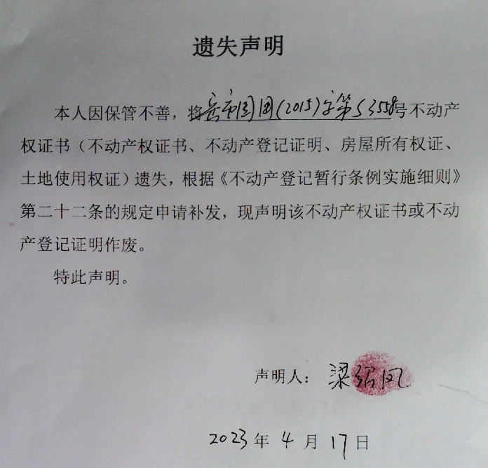 遗失声明(梁绍凤)