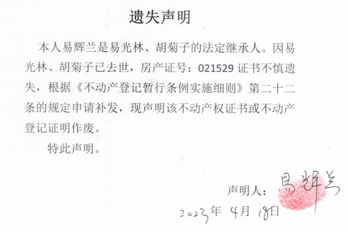 遗失声明(易辉兰)