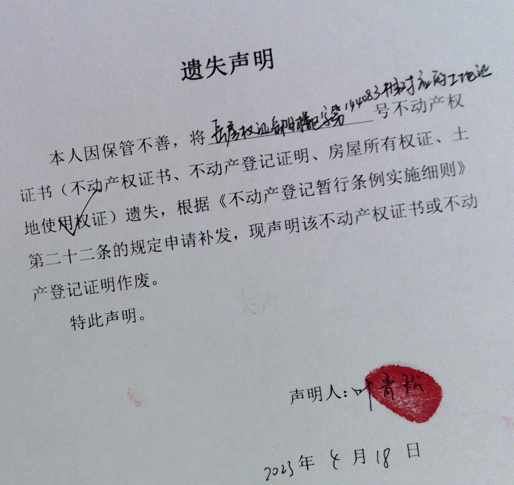 遗失声明(叶青松)