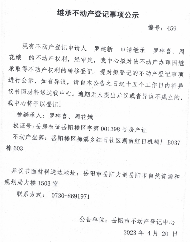 继承不动产登记公示 编号:罗建新(459)