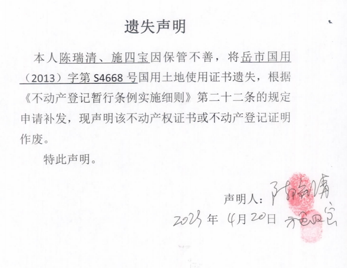 遗失声明(陈瑞清、施四宝)