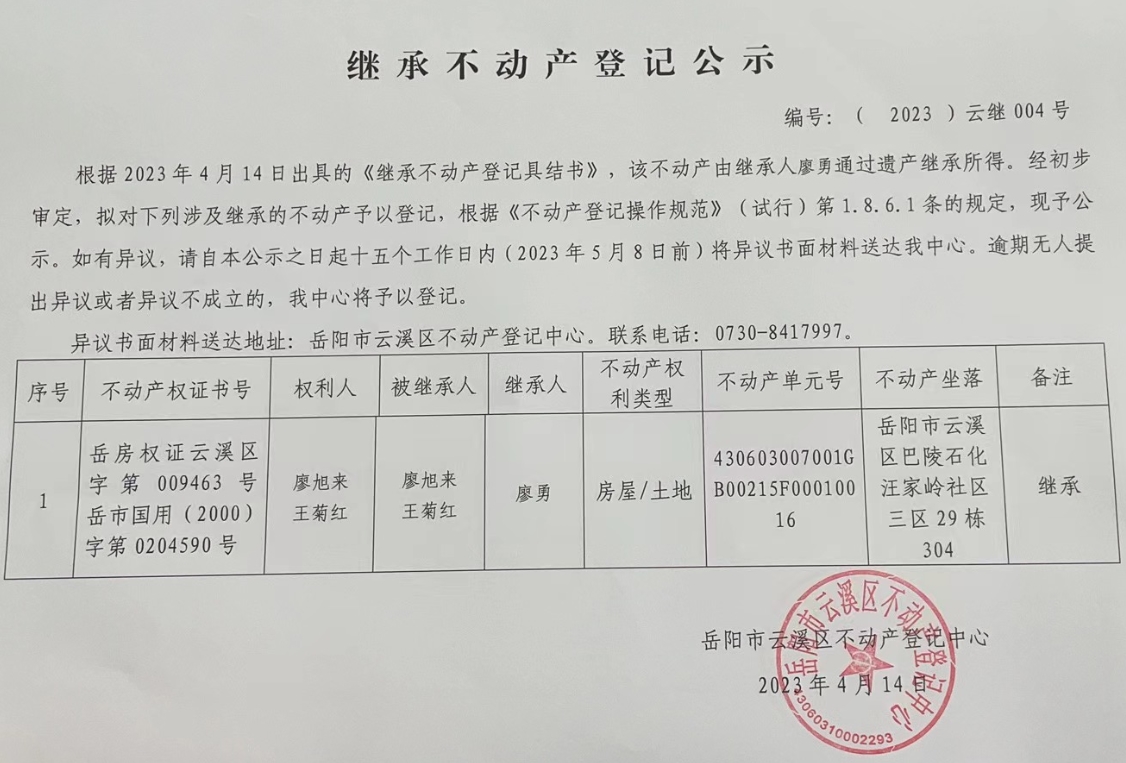 不动产继承公示 编号:(2023)云继004号