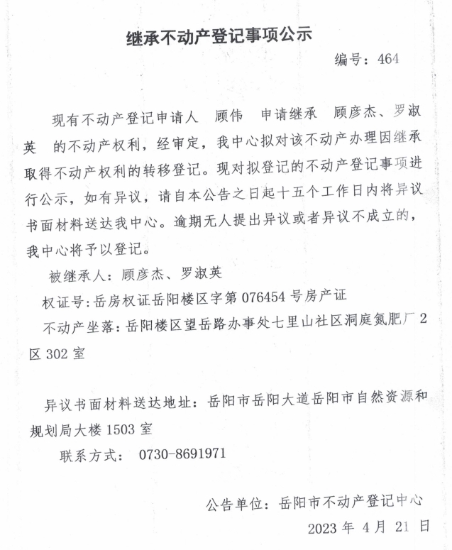 继承不动产登记公示 编号:顾伟(464)