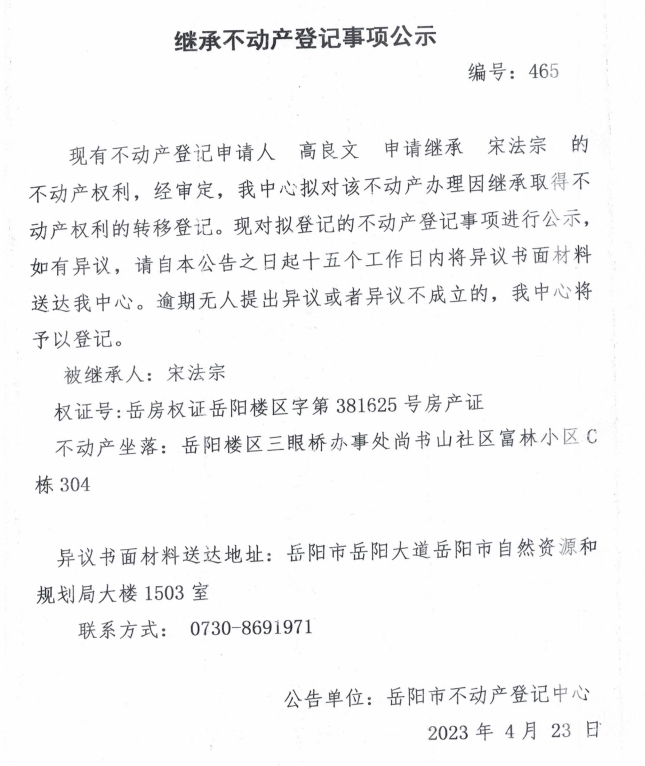 继承不动产登记公示 编号:高良文(465)