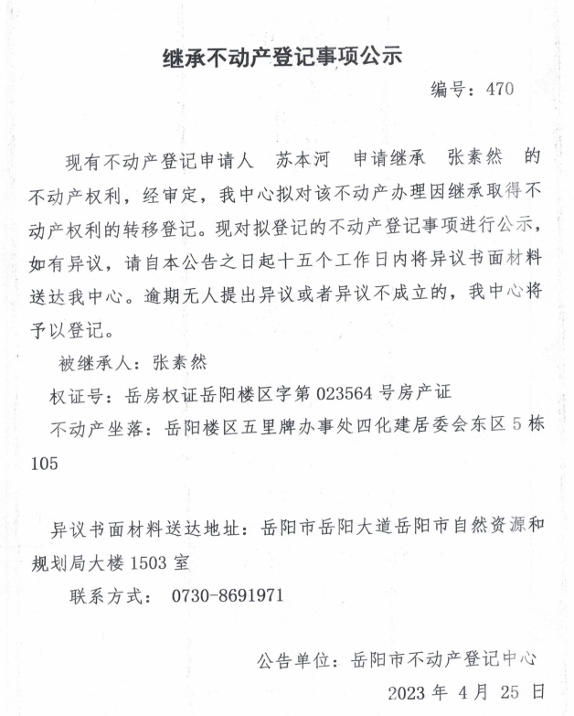 继承不动产登记公示 编号:苏本河(470)