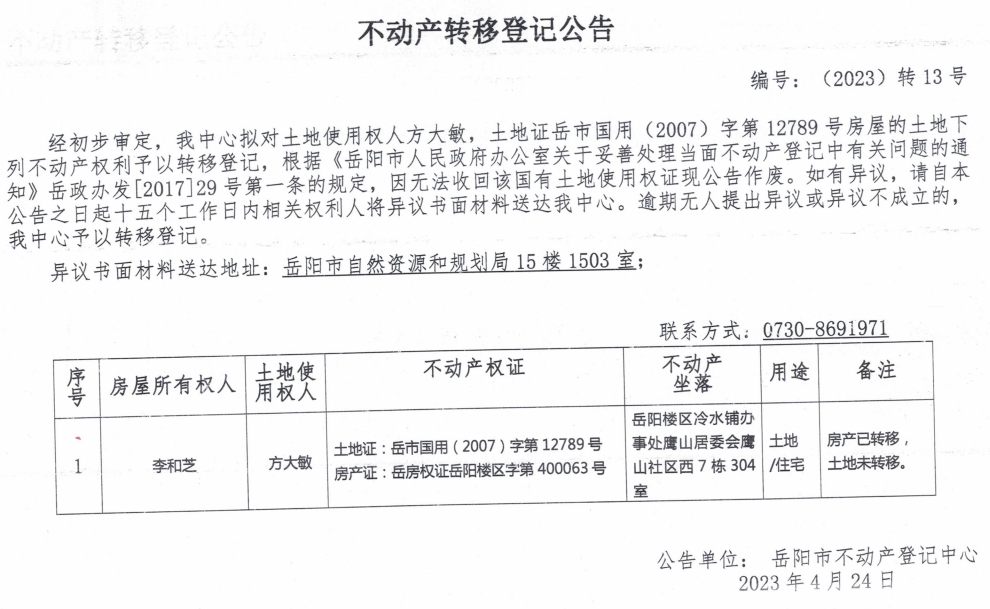 不动产转移登记公告 编号:转013(方大敏)