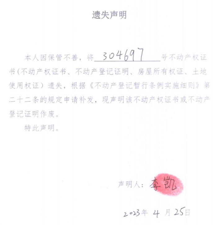 遗失声明(李凯)