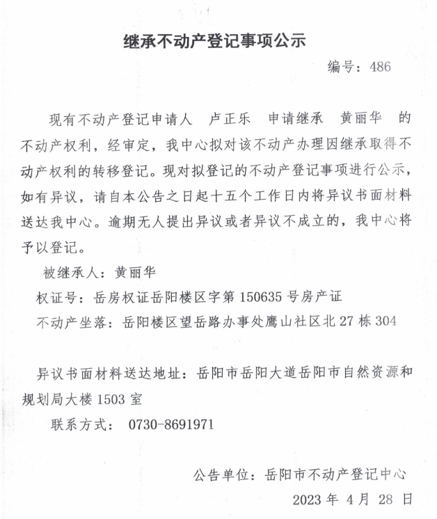 继承不动产登记公示 编号:卢正乐(486)