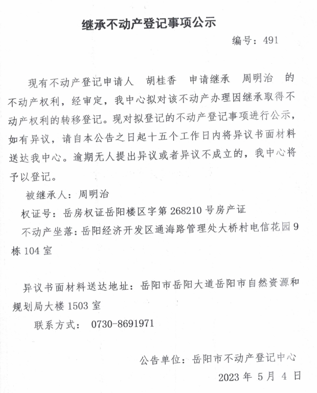 继承不动产登记公示 编号:胡桂香(491)