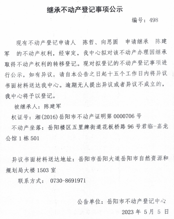 继承不动产登记公示 编号:陈哲、向思圆(498)