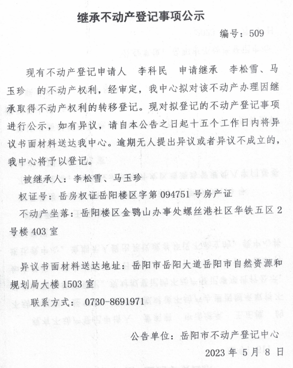 继承不动产登记公示 编号:李科民(509)