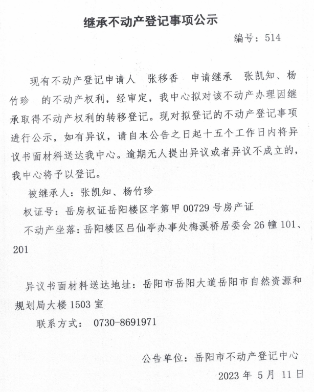 继承不动产登记公示 编号:张移香(514)