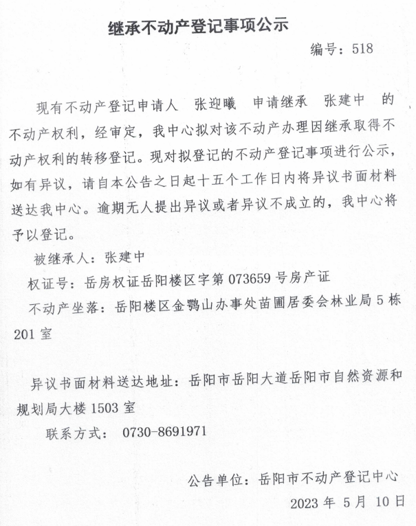继承不动产登记公示 编号:张迎曦(518)