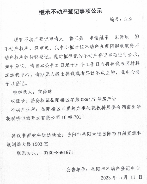 继承不动产登记公示 编号:鲁三秀(519)