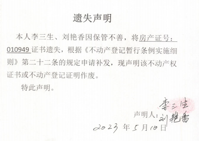 遗失声明(李三生、刘艳香)