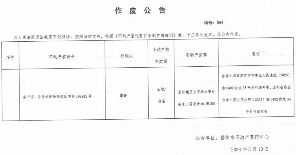 作废公告 编号:064(谭媛)