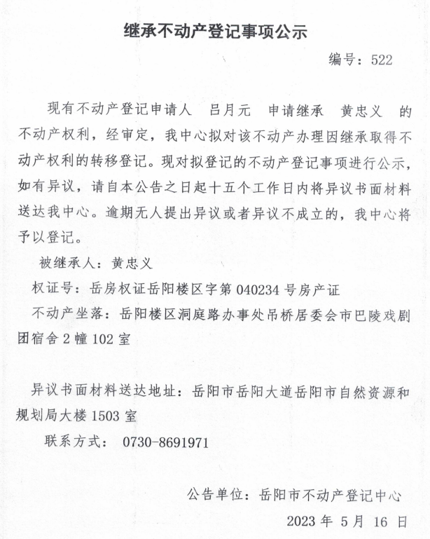 继承不动产登记公示 编号:吕月元(522)