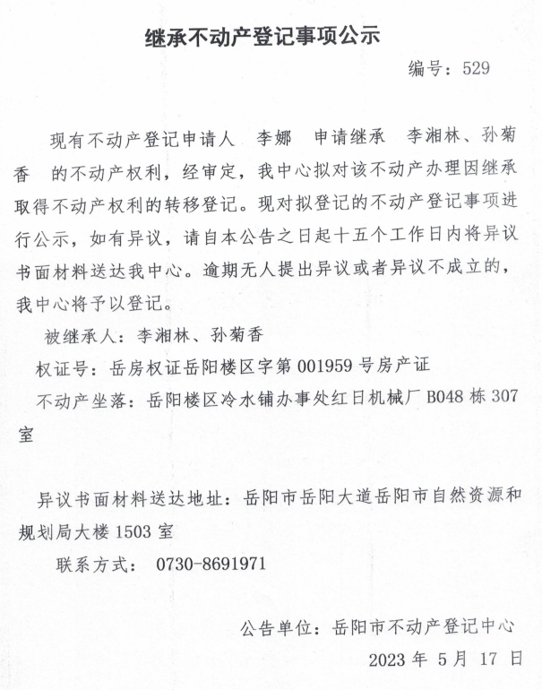 继承不动产登记公示 编号:李娜(529)