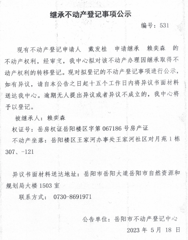 继承不动产登记公示 编号:戴发桂(531)