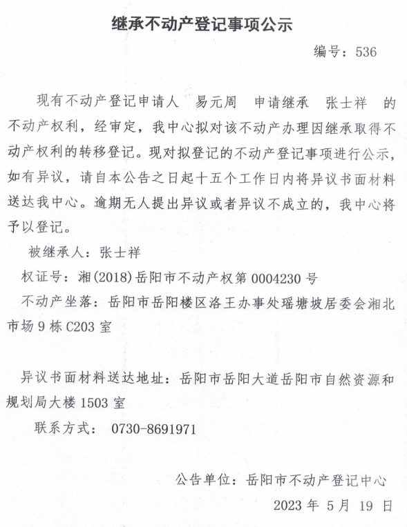 继承不动产登记公示 编号:易元周(536)